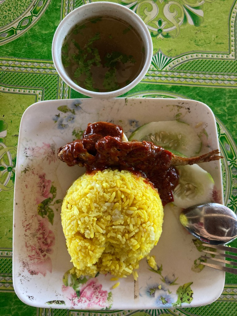 从市区一路去可以在半路 25公里 Hentian Rehat Balung Cocos 上个厕所和吃点东西。这里的 Nasi Kuning(黄饭)味道不错,推荐可以试一下,而且价钱也很便宜,黄饭加鱼才要3块钱马币,黄饭加鸡腿才要4块马币。厕所不是很干净,也不能说非常肮脏,勉强还是可以的