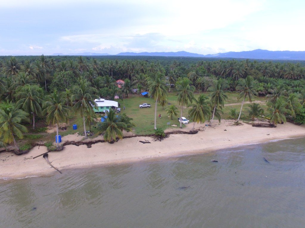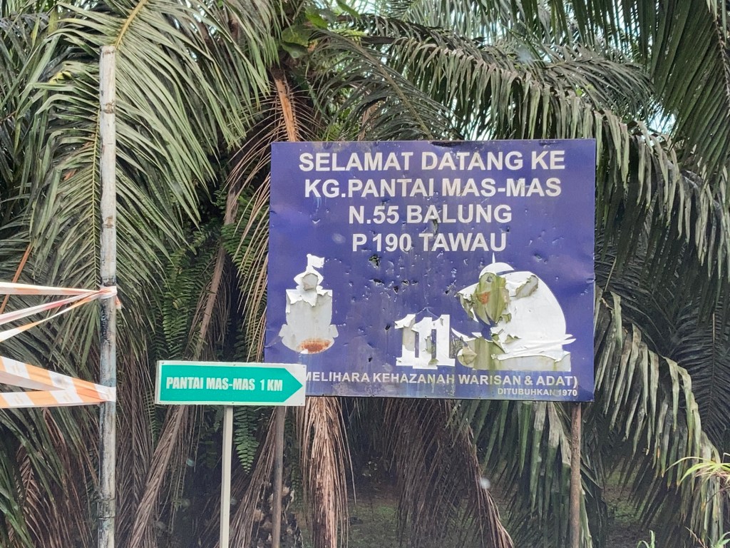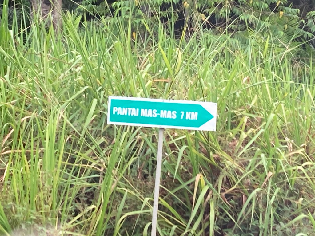 然后再行驶4公里左右,在交通圈转入右边,然后在行驶1个小时左右才能到达 Pantai Mas Mas。由于路面很烂,不建议开小车来。一路上会看到第一个路牌 Pantai Mas Mas 7KM,左边路牌写着 JLN SG.MAS,所以要选择 Pantai Mas Mas 7KM, 然后会看到 Pantai Mas Mas 5KM,走不久会看到 Pantai Mas Mas 1KM。