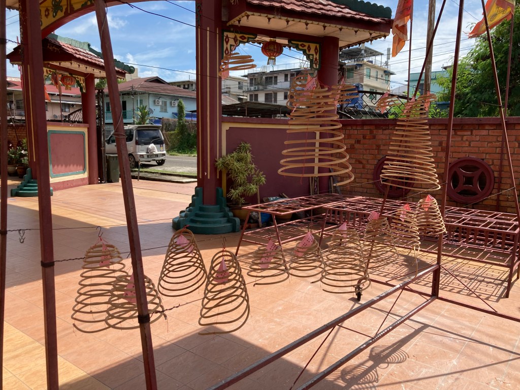 天后宫离斗湖市区0.67公里,打GRAB来大约5马币,如果要走路过来也是很方便。来到天后宫才知道拜神有顺序,1)先拜天神,2)然后右边门神左边门神,3)水尾,天后,排海,4)观音,5)关帝,华光,6)地主,7)孤魂神牌。除了地主用5支香,其他神位用3支香。