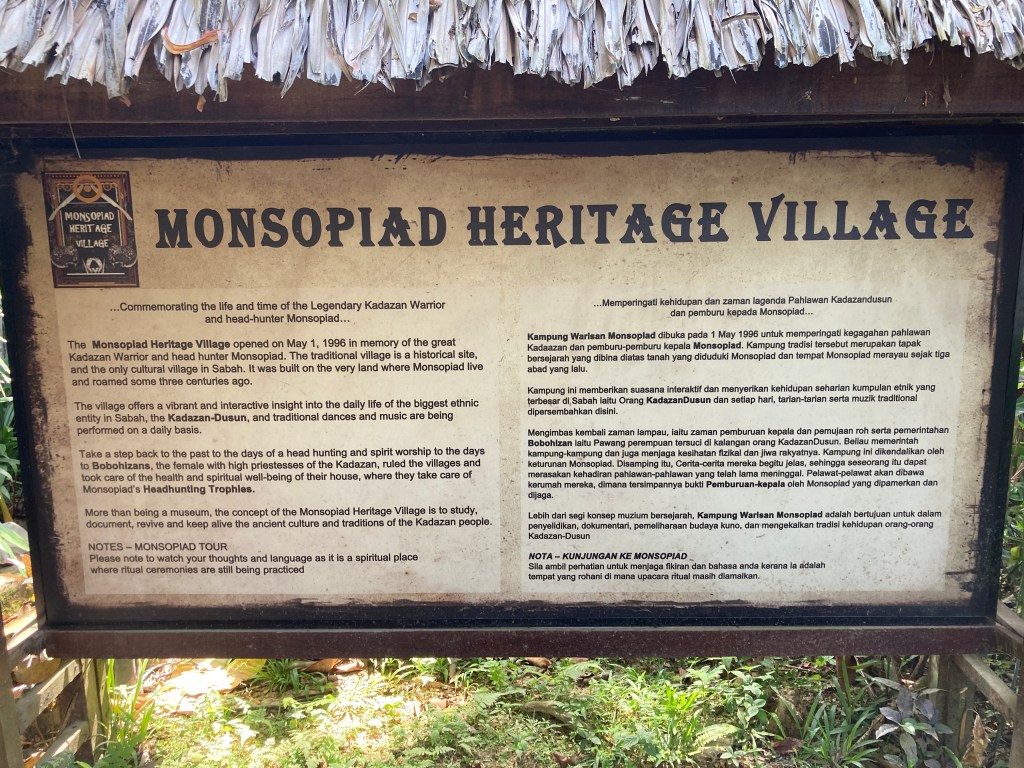 从亚庇市区到 Monsopiad Heritage Village 约10公里, 打车(Grab)大约16块马币。到了过后需要买门票25块,然后有一名导游会带你浏览。首先导游会介绍一颗古老的树,原住民都向着这棵树做通灵仪式,请求丰衣足食或消除妖魔鬼怪。接下来就会去 Monsopiad(蒙斯皮亚德)博物馆。里面陈列了当时Monsopiad(蒙斯皮亚德)使用的武器,容器,还有一些文件,还有一些他们当时的日常用品等等。参观完Monsopiad(蒙斯皮亚德)博物馆后,导游就带我们去品尝原住民的美食,还有介绍制作方法。当中有他们自己娘的酒,还有生长在 Pokok Rumbia(兰比亚树)的虫子。