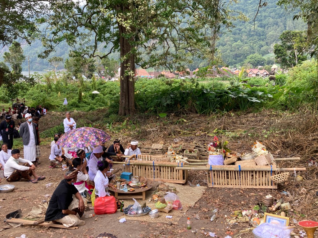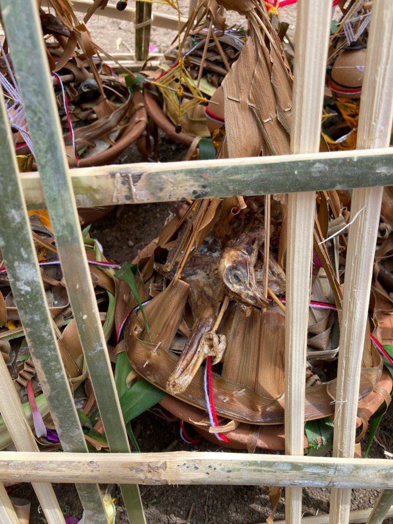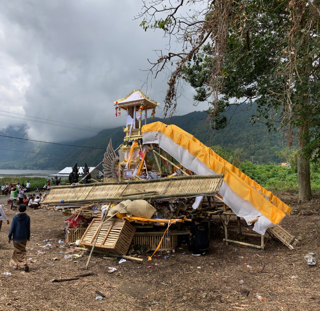 结束了诡异的 Trunyan 坟墓之旅,就开车回住宿,途中遇到很多人聚在一起,很多人站在马路旁,于是便停下车子上前询问发生什么事。她们说是火葬仪式,这正是我想要了解的其中一个仪。虽然仪式差不多结束,但是我可以从当地人的口中了解火葬的意义。可以看到他们把塔建起来高高,在顶部看起来像一张椅子,下面是很多别人的奉献的贡品,有吃的,用的等等。比如有牙膏,牙刷,水果等等,都是人们的一些日常用品