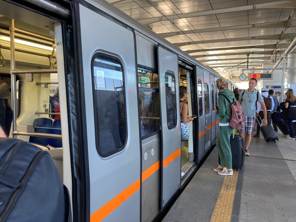 从机场走出来,然后从天桥直走,地铁站就在前面。从机场到市区或从市区到机场收费是9欧元一趟,这里买票系统有点复杂,所以直接去柜台购买,市中心站是 Syntagma。