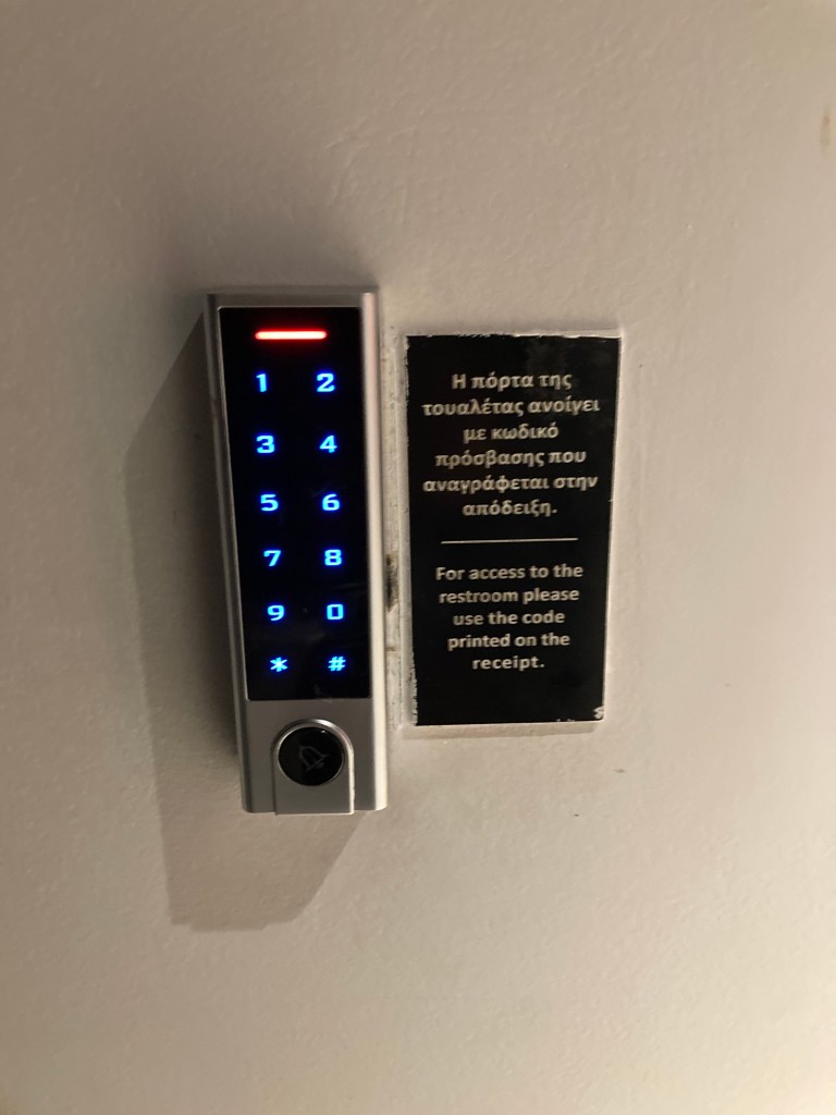 雅典的地铁站都没有厕所,在街上也是很难找到厕所,如果要上厕所可能需要到餐厅消费然后用餐厅的厕所。我看到一个都一次见到的东西就是上厕所还需要按键密码,在肯德基消费的时候,收据上有打开厕所们的密码,按照收据的密码就可以上肯德基的厕所
