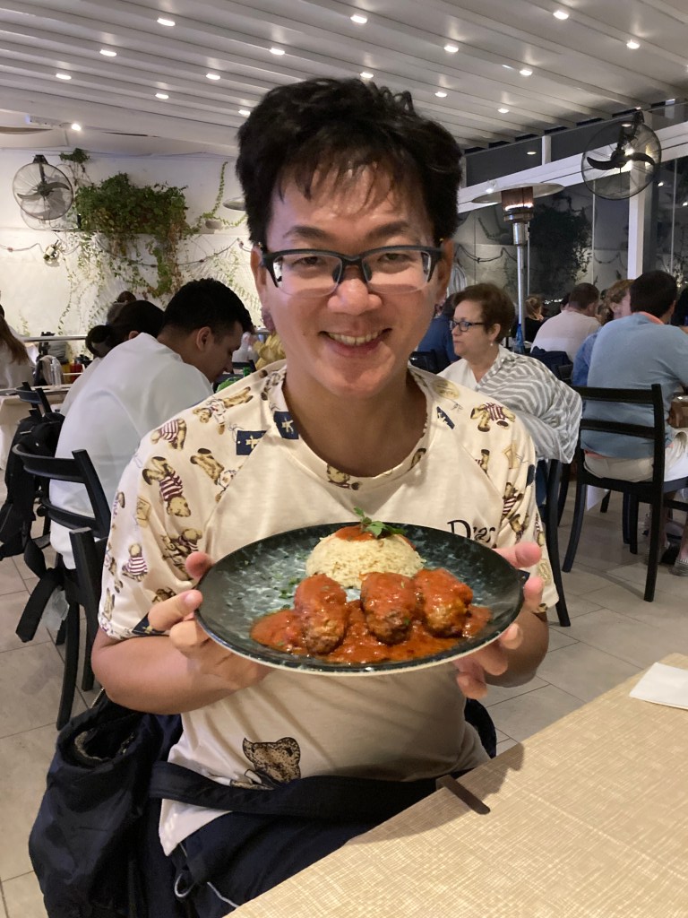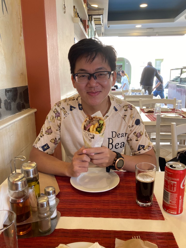 结束了阿克罗蒂里(史前城市)的餐馆就乘搭公交车回到市中心 FIRA,准备前往北部期待已久的蓝顶教堂,回到市中心先吃个午餐,午餐选择了当地的美食 Souvlaki,类似汉堡,里面有的是鸡肉有的是羊肉加上些蔬菜