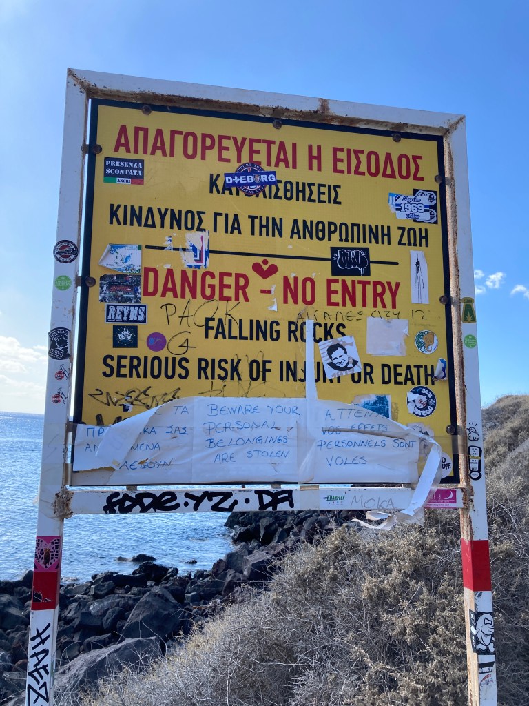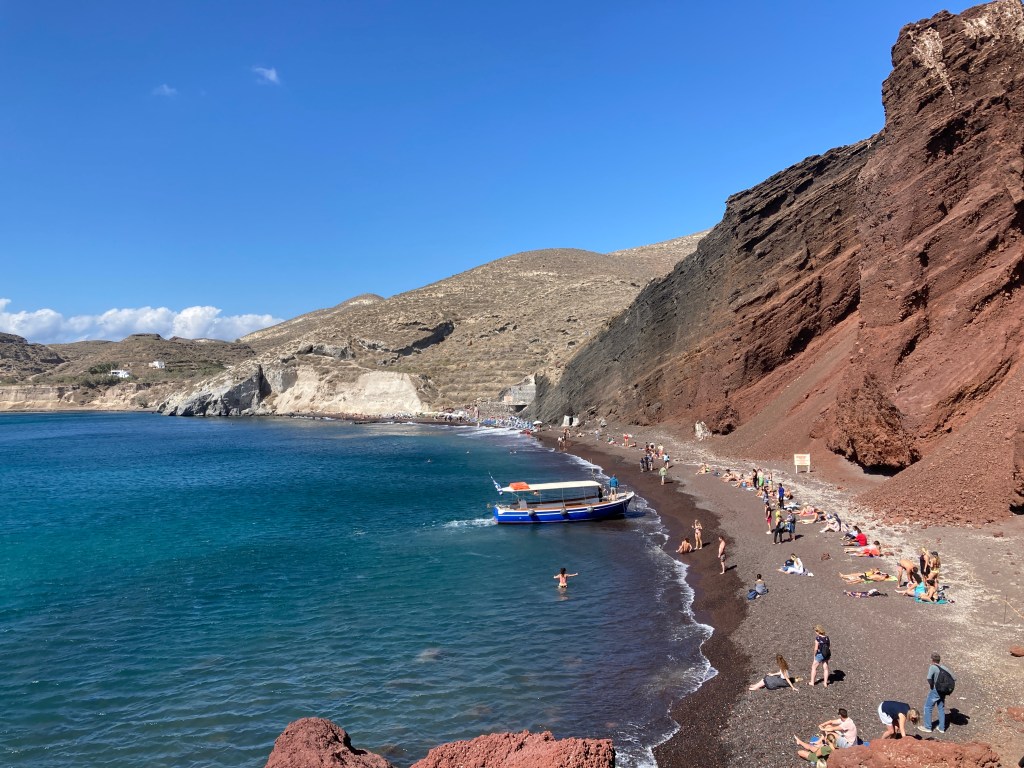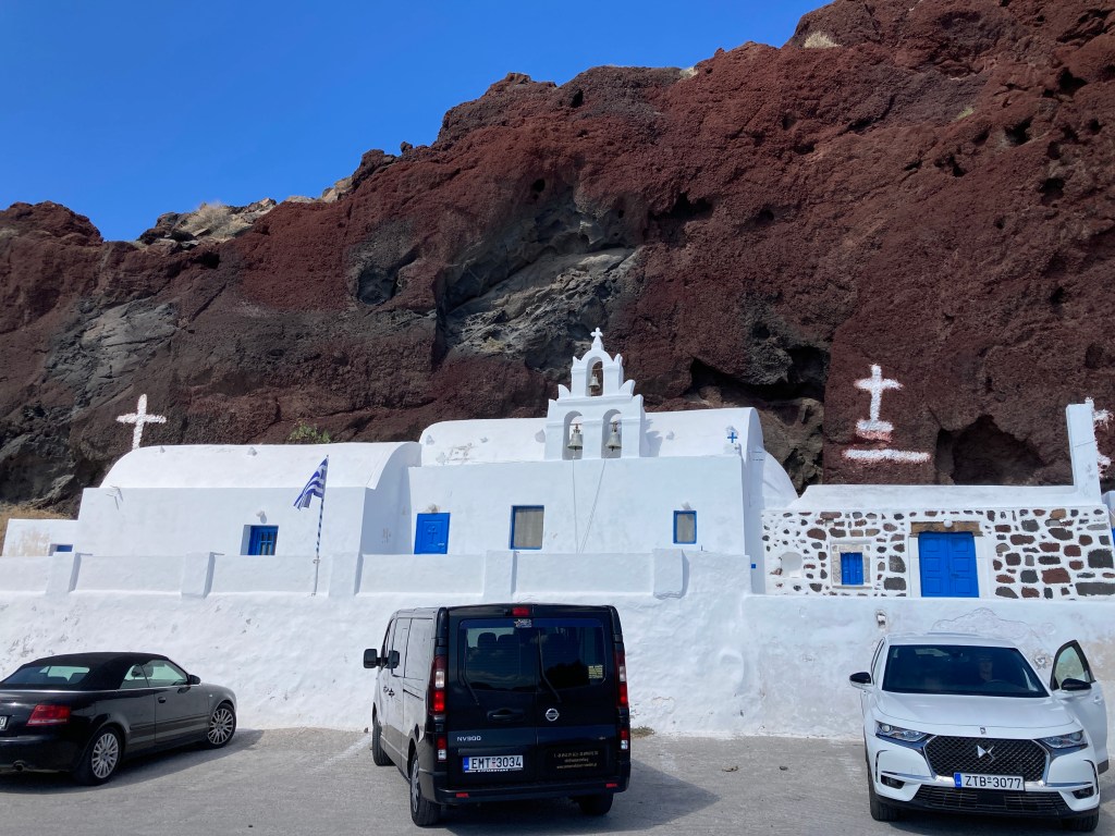 在公交车站买票到 Akrotiri 票价1.8欧元,直接坐到最后一站步行约10分钟就到达圣托里尼红海滩(Santorini Naturist Red Beach)。这里的风超大,面向爱琴海,海上有很多白色的船,加上从远处就能听得到小提琴的音乐,感觉真的有够浪漫。一路上可以看到的到3钟教堂,还有巨大的岩石