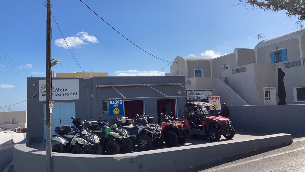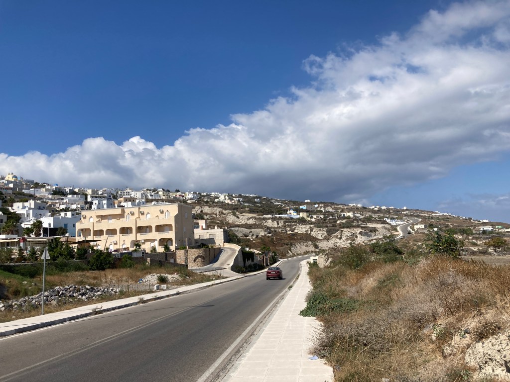 睡了一觉隔天早上就到处逛逛,圣托里尼主要分为北部的蓝顶教堂 “Oia”,中部是中心 ”Fira“ 和南部的红色沙滩 “Akrotini”。一出门就看到到处有游客开着越野型沙滩车,到处也有出租,询问了一下一天的费用要100欧元,感觉有点贵而且有市内公交车可以到达任何的地方,所以就没有租了