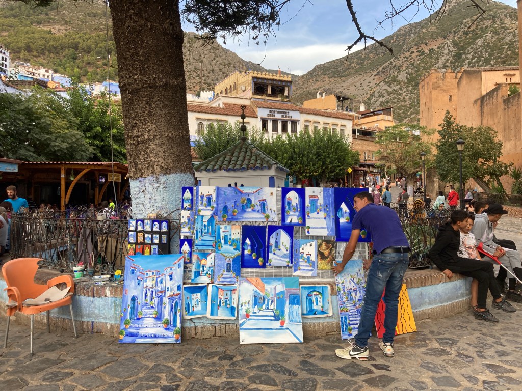 参观完毕 Kasbah,就步行到西班牙清真寺 Spanish Mosque,这个清真寺在一座山上,在远处就可以看的见了,在日落时分很多人来这里,可以观看蓝色小镇意外,还可以观看美丽的日落。西班牙清真寺看起来好像很远,但是其实步行过去不会很远,大概20分钟左右就到了,一路上你可以看到很多人在卖纪念品