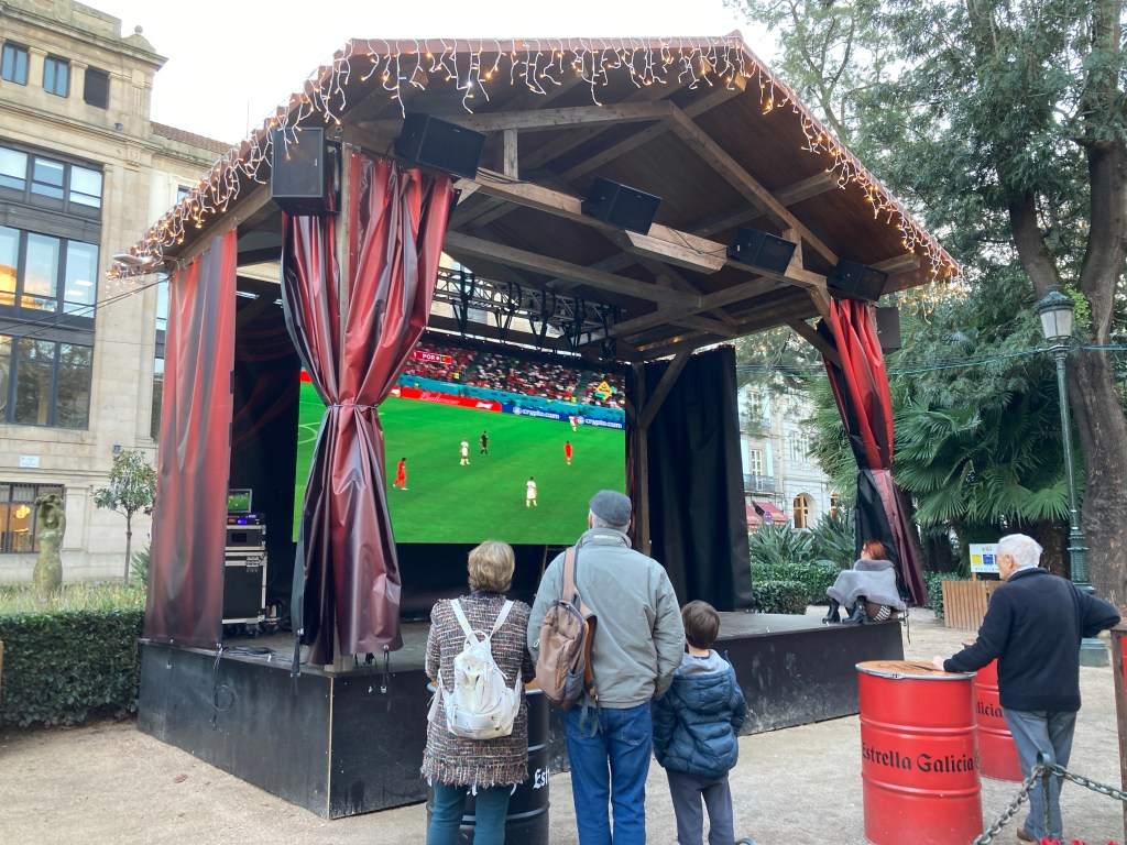 这里卖啤酒的地方也提供了大荧幕让球迷一边喝酒一边看球