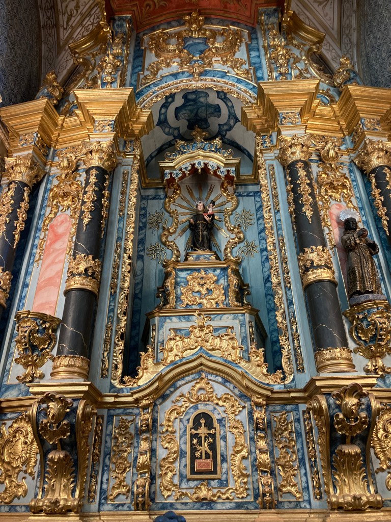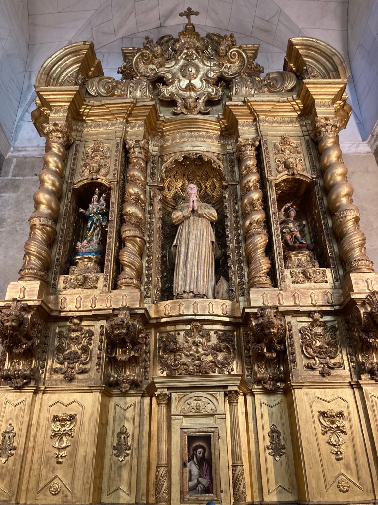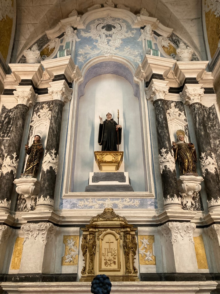 在宽阔的中殿中,有十个开放的小礼拜堂,由镀金和彩色雕刻的祭坛(18 世纪)和灰泥(19 世纪)组成。 有些来自 Convento da Graça 教堂,在那里他们免于毁灭。 在洗礼池中,有圣佩德罗老教堂的洗礼池,以及来自圣莫尼卡老修道院的软木,是基督在约旦河洗礼的奇特表现。