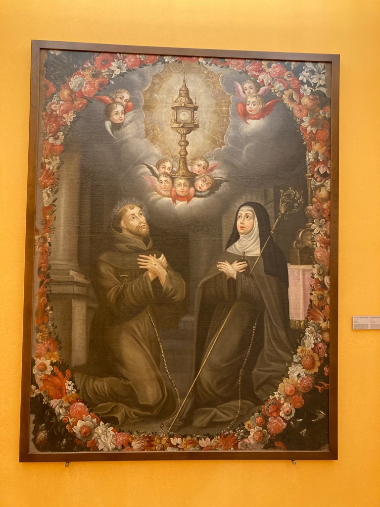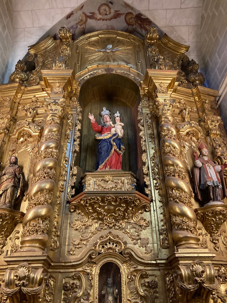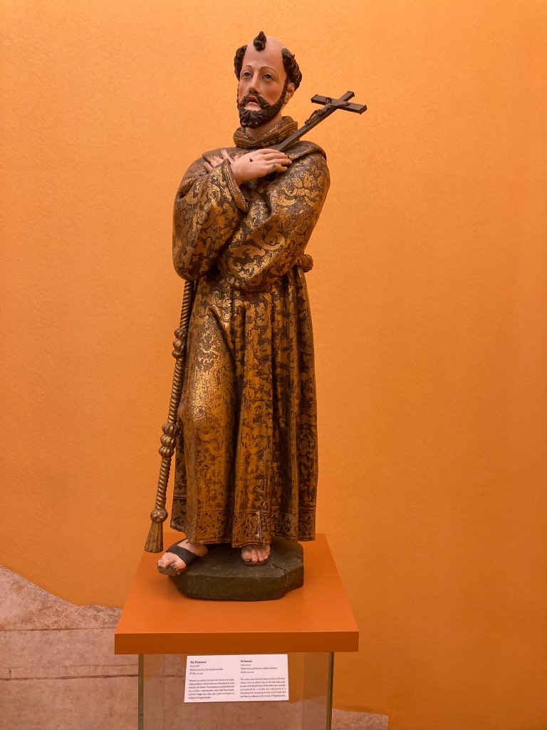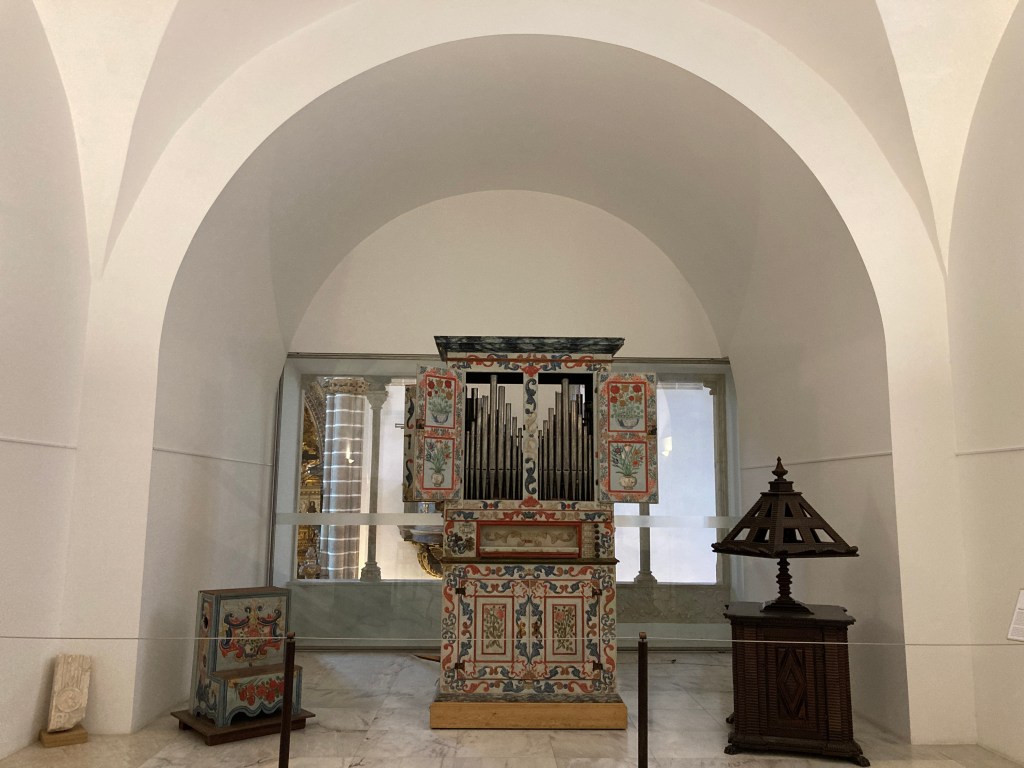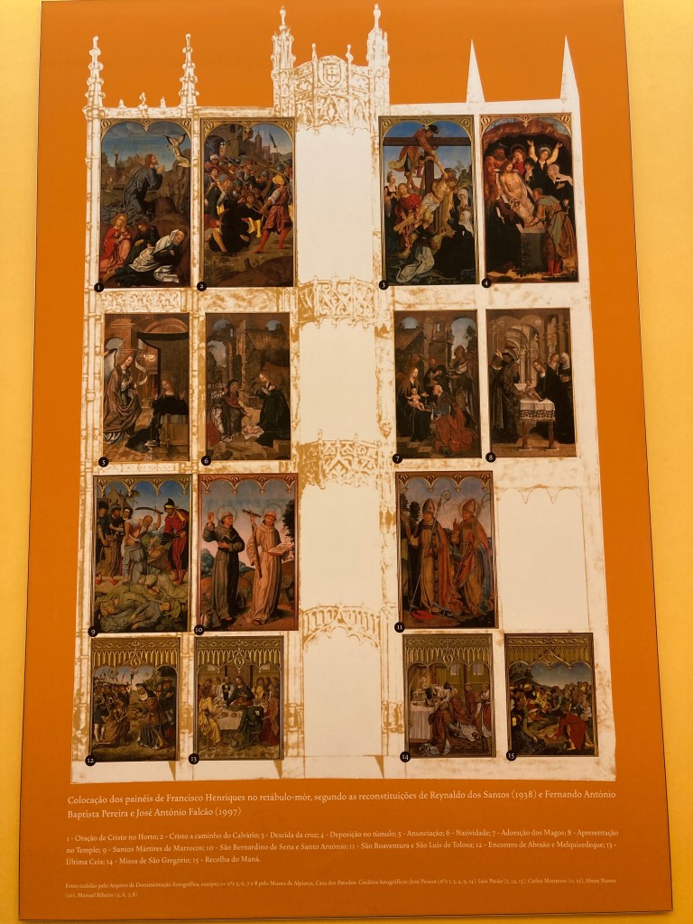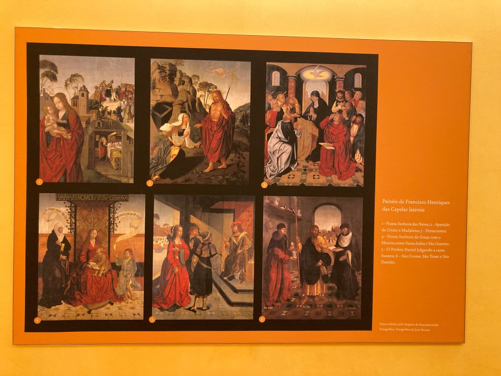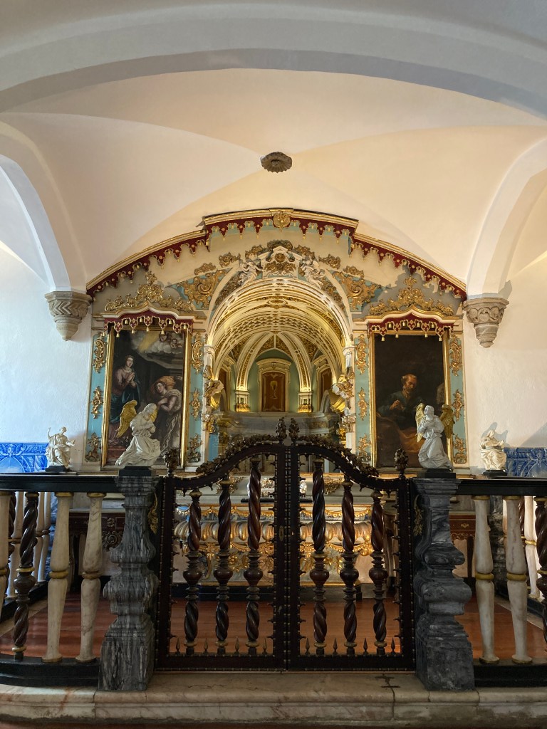 圣坛上的祭坛画取代了埃武拉圣弗朗西斯科修道院的多联画,这是一套文艺复兴时期的画作(目前散落在埃武拉和古代艺术博物馆各处)。 目前的祭坛画是大理石作品,与曼努埃尔式的空间环境形成鲜明对比。 它展示了圣弗朗西斯和圣多米尼克的大幅画像,这在方济会教堂中很常见。 小教堂的立面上有两扇漂亮的文艺复兴时期大理石窗户,皇室成员可以从窗户观看宗教仪式(16 世纪)和一架 18 世纪的大型管风琴(帕斯科尔·卡埃塔诺·奥尔多维尼 (Pascoal Caetano Oldovini) 设计)。 摊位上装饰着各种方济各会圣徒的画像, 祭坛上仍然有几幅文艺复兴时期的画作。