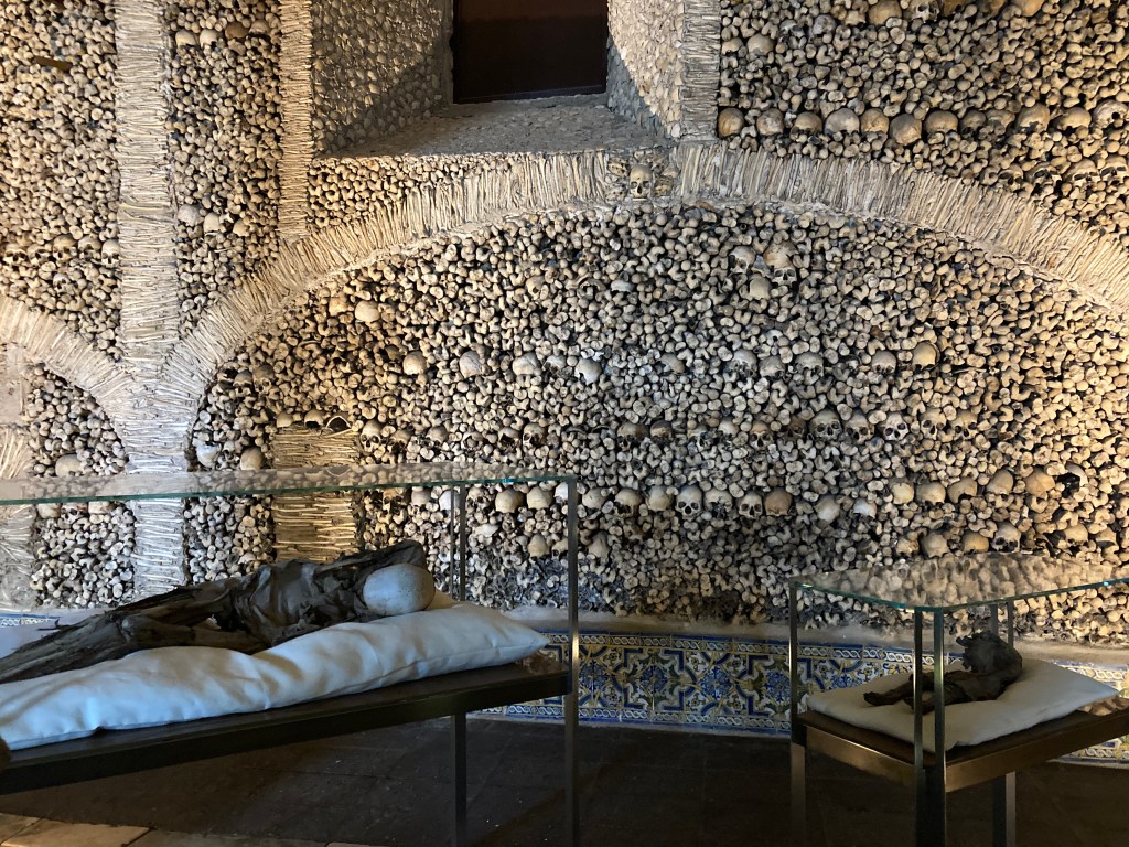 大约 5000 人的头骨和骨头精心排列,覆盖墙壁和柱子, 这是一个相当艺术的创造,形成装饰的图案。当时这座城市的墓地实在是太拥挤了,所以骨骼被挖掘出来,以便新的尸体可以取代它们。 人们曾认为这些人是 14 世纪在欧洲造成数百万人死亡的瘟疫的受害者,但研究发现它们只是埃武拉普通民众的遗体,埋葬于不同时期。 还有两具木乃伊,传说是一对父子,但 2019 年完成的一项科学调查得出的结论是,他们实际上是一个女人和一个女孩。 这名妇女死于 30 至 50 岁之间,可能死于牙齿感染,而女孩只有 2 或 3 岁。