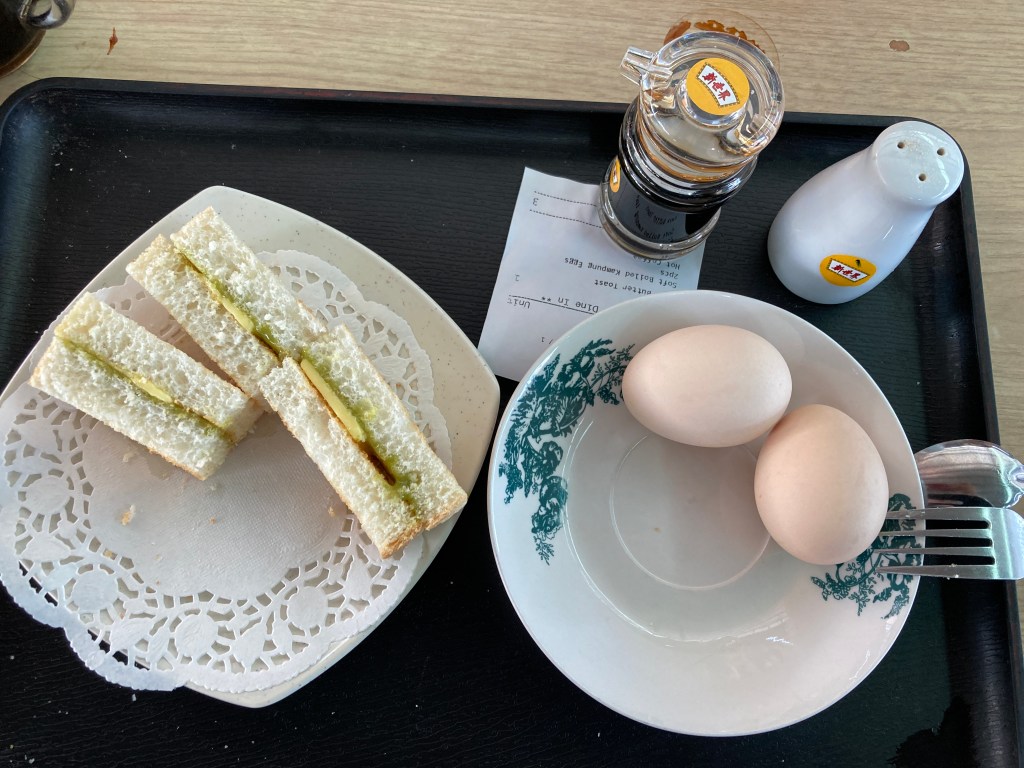 下午茶,两颗半生熟蛋加上咖央醬牛油(Kaya Jem)土司,是最道地的吃法
