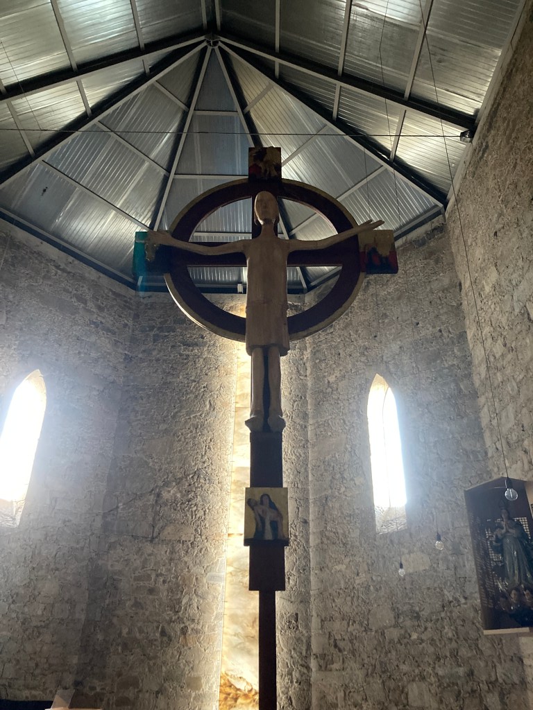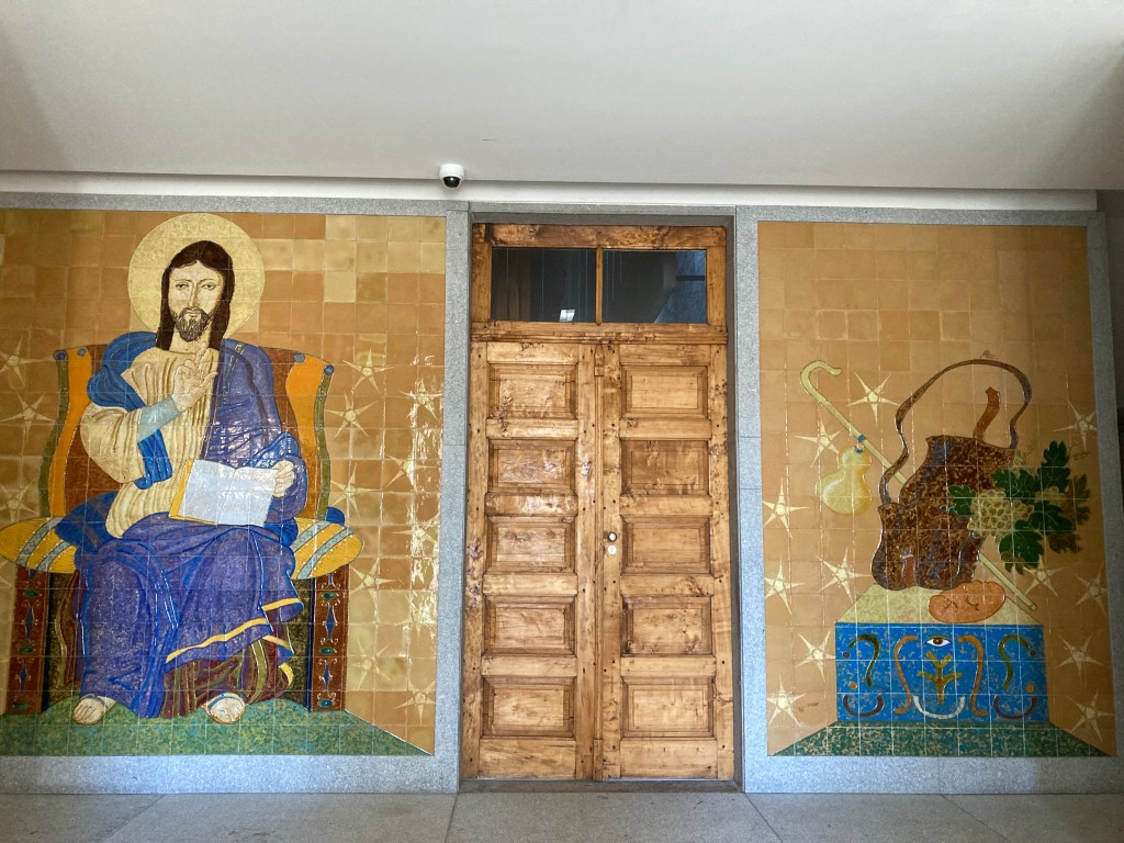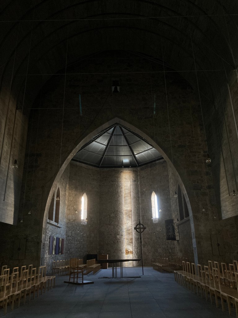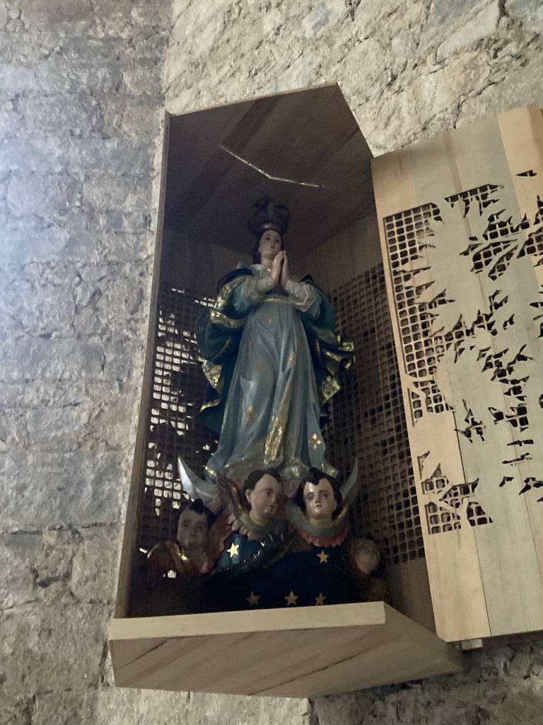 在背景中,一个大理石裂缝升起,自然背光,将观众带到另一个物理和精神维度。 因此,通过它的构成和规模,这个空间被赋予了更高的可理解性和精神层面,允许空间、个人和神圣之间的对话。
