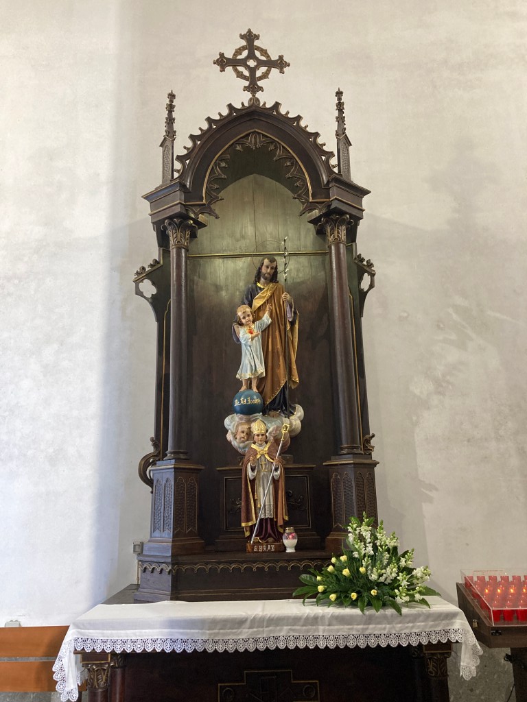内部非常简单,有一个拉丁十字平面图,一个相当长的中殿,带有一个桶形拱顶屋顶。 它的特点是存在六根柱子,大窗户在六根柱子之间打开,支撑着构成天花板的拱门。 高唱合唱团位于带有石栏杆的凹陷拱门上。 圣水池由大理石制成,带有圆顶屋顶的横断面带有彩色玻璃窗。