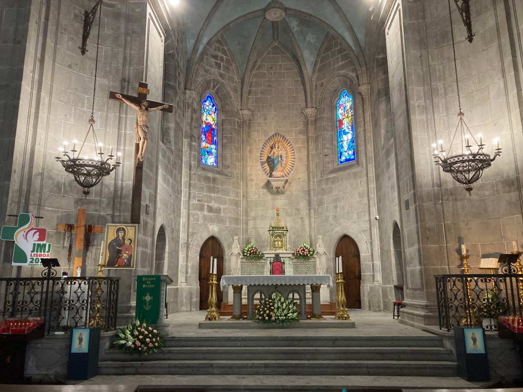 圣坛有拱形屋顶。 耳堂由托斯卡纳壁柱上的四个完整拱门构成,有框架和靠垫,拱心石上有纹章。 断拱门相连的耳堂被玫瑰窗、彩色玻璃照亮,还有两个小的雕刻祭坛。 即使在今天,圣母圣母圣殿的改善工作仍在继续,它雄伟而美丽,仍然是一个伟大的奉献精神和迷人的地方。
