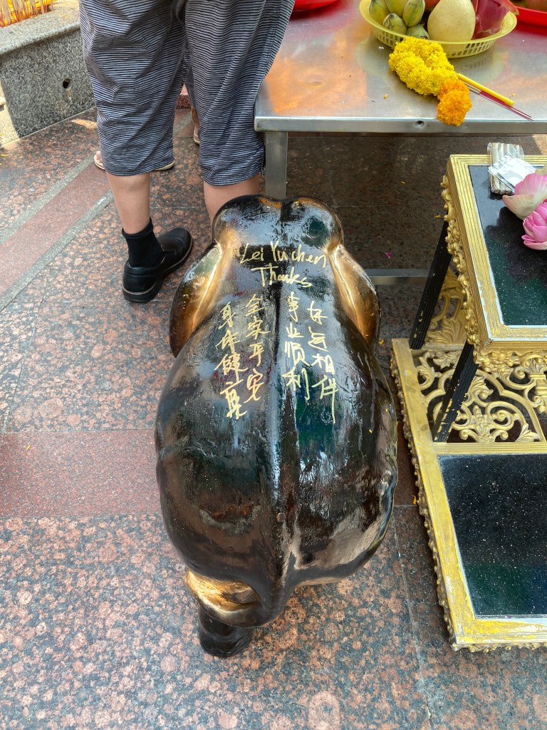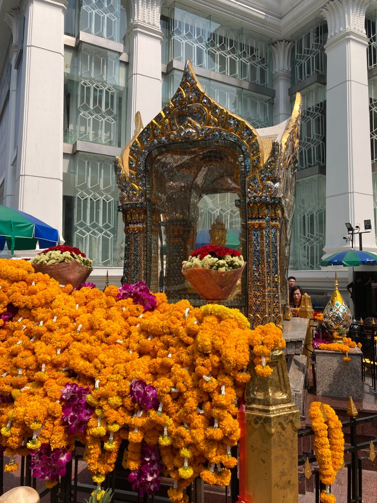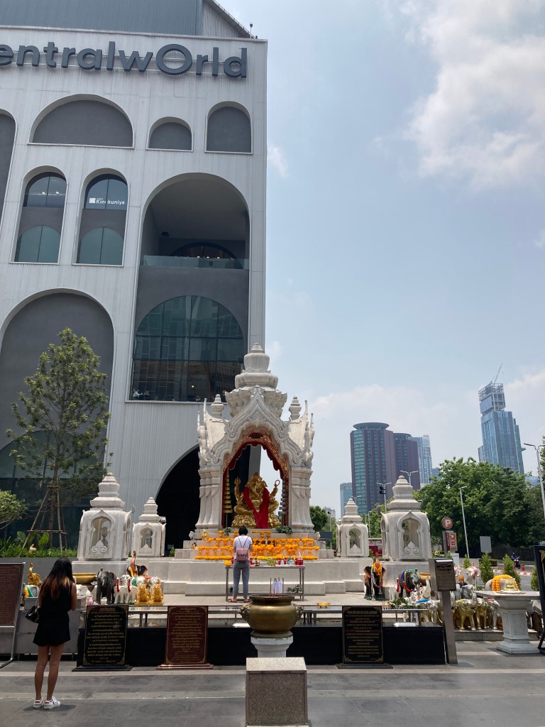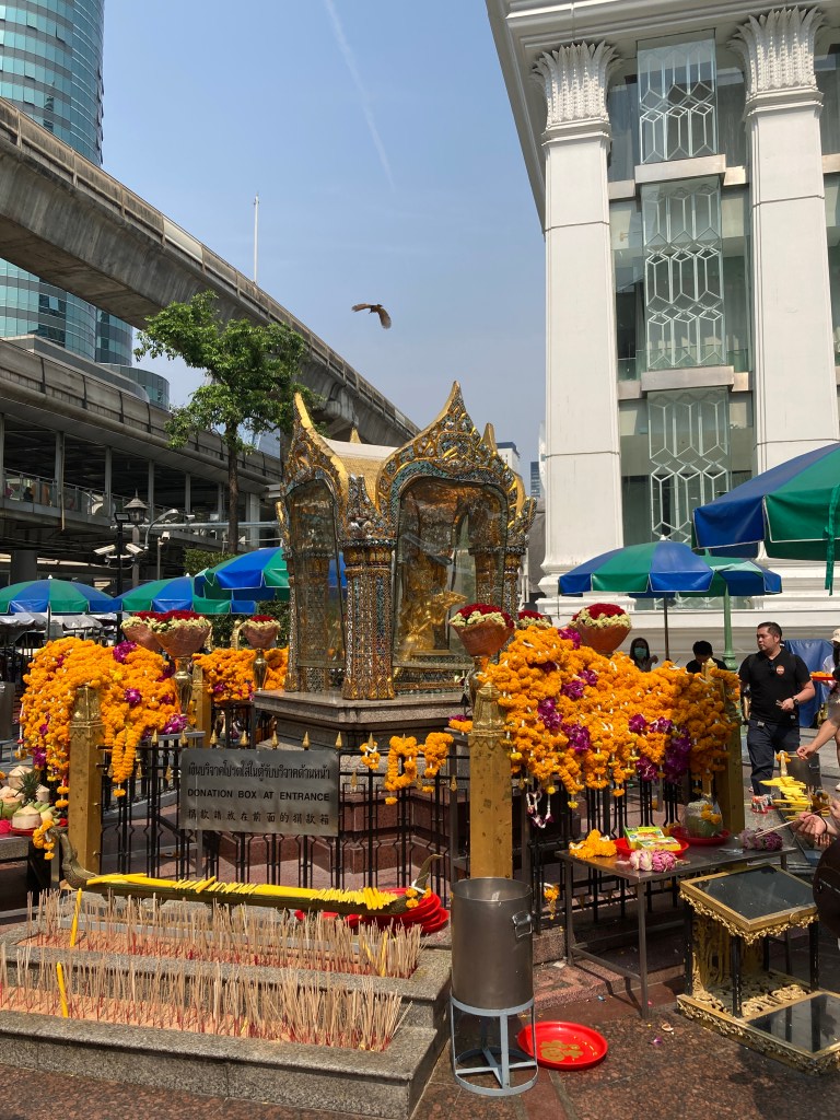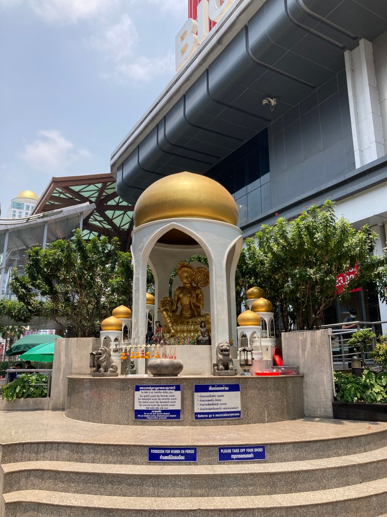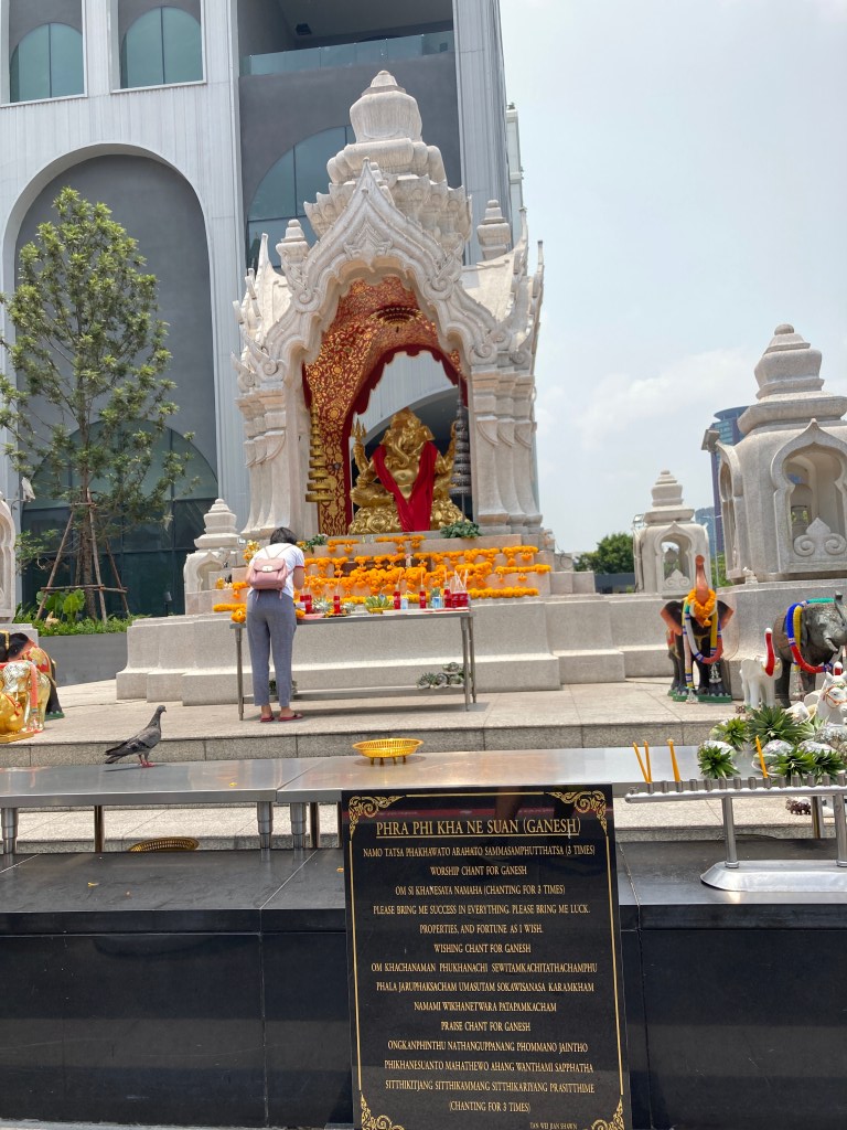 该神庙位于曼谷市中心,是泰国佛教信仰的重要场所之一,吸引了大量当地和外国游客前来参观和朝拜。神庙中供奉着”Umathevi”和其他神灵,游客可以在此献上香火、祈求心愿,并领取神庙赠送的象征吉祥的红绸手链。