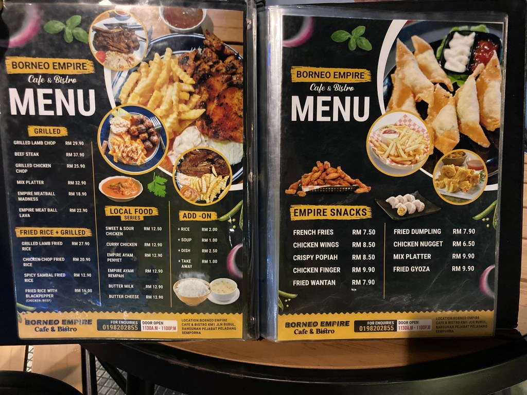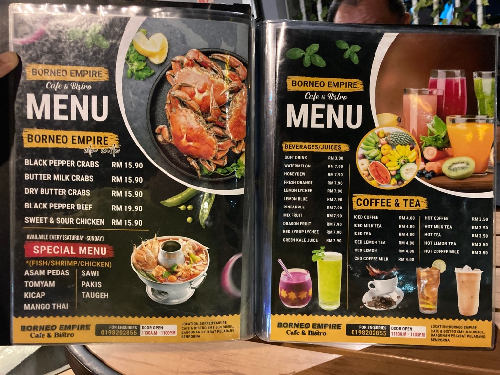 I didn’t expect to find such a great restaurant in this small place, Semporna. While the prices are a bit higher than regular restaurants, you do get a bit more food. It’s also a place for drinks and watching live football matches. Being on the second floor, you can see the bustling street with cars coming and going, and it’s right next to the local Semporna night market.